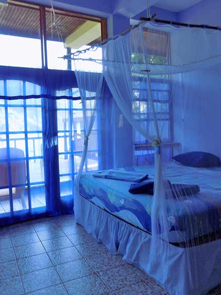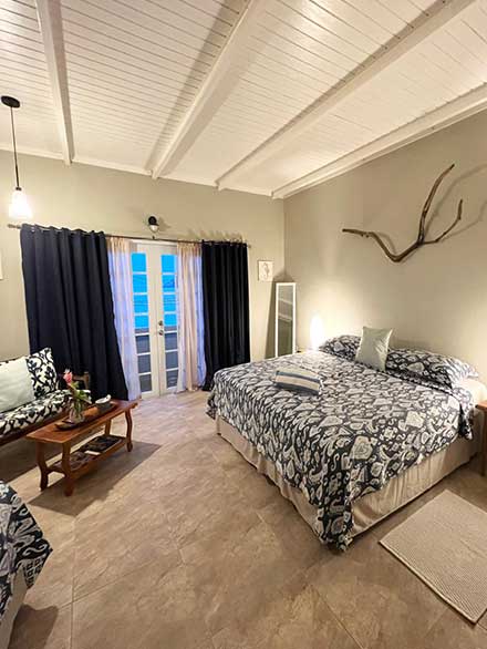 We have four studio apartments with a stunning view over the bay and a large deck, as big as the room, approximately 17 feet by 25 feet. Each room has a kingsize bed, a private bathroom, a fully fitted kitchen and a queen size futon sofa bed. There is a standing fan and a ceiling fan and also hot water showers. We have a recycling area and this is encouraged positively. The beach is located 30 feet down and about 2 minutes walk from your room. We have a restuarant next to the beach, serving delicious seafood, local meat and drinks, cocktails.