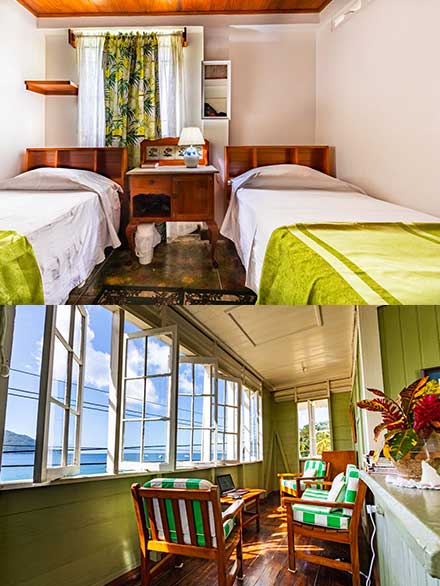 The Cholson Chalets are 6 self-catering apartments with 12 rooms perfectly placed at the pier in Man Of War Bay, Charlotteville, Tobago. These charming white and green antique buildings, complement the natural surroundings of the garden, while on the inside, the stained wooden floors and vintage ornamental fretwork, complimented with freshly picked floral arrangements are paired with modern appliances to provide well ventilated breezy living spaces reminiscent of Home. Here, the lullaby of waves and the living sounds, sights, and scents of the fishing village punctuate your days and nights with delightful diversions. You and your family can enjoy hiking, sightseeing, birdwatching, fishing and snorkelling.
